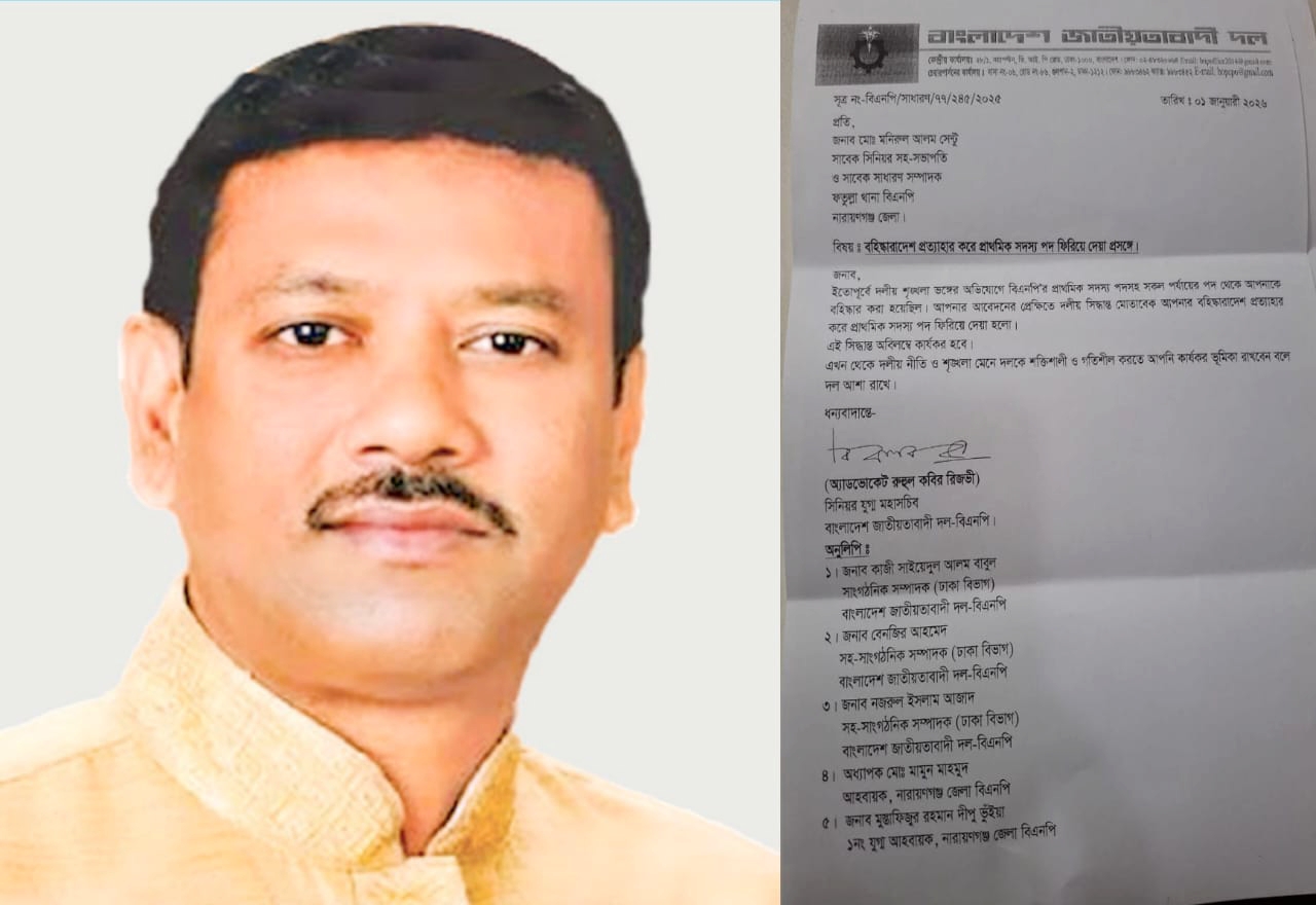 এসটি নিউজঃ কুতুবপুর ইউনিয়ন পরিষদ চেয়ারম্যান, ফতুল্লা থানা বিএনপির সাবেক সিনিয়র সহ-সভাপতি, আলহাজ্ব মনিরুল আলম সেন্টুর বহিষ্কারাদেশ প্রত্যাহার করে প্রাথমিক সদস্য পদ ফিরিয়ে দিলেন বাংলাদেশ জাতীয়তাবাদী দল বিএনপি। উক্ত বহিষ্কারাদেশ প্রত্যাহার চিঠিটি স্বাক্ষর করেছেন বাংলাদেশ জাতীয়তাবাদী দল বিএনপির সিনিয়র যুগ্ম মহাসচিব অ্যাডভোকেট রুহুল কবির রিজভী।